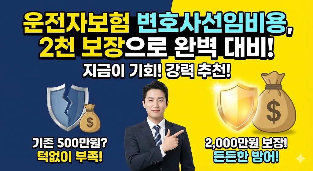변호사선임비용 2천 보장 운전자보험에 대해 알아보겠습니다. 운전자보험 변호사선임비용 보장을 선택할 때 2천만원은 가장 인기 있는 보장 한도 중 하나입니다. 보험료 부담과 보장 범위의 균형이 좋아 많은 운전자들이 선호합니다. 이 글에서는 변호사선임비용 2천 보장 운전자보험 추천 이유, 가입 시 확인해야 할 사항, 추천 대상 등을 상세히 정리했습니다.